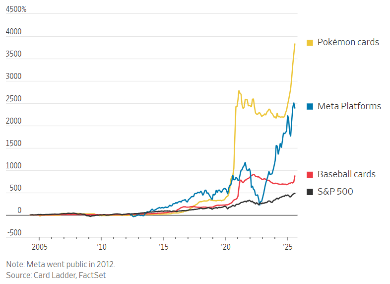 Chart of the week: Pokémon trading cards have become a hot investment, outperforming top stocks and the SP500 by leaps and bounds.